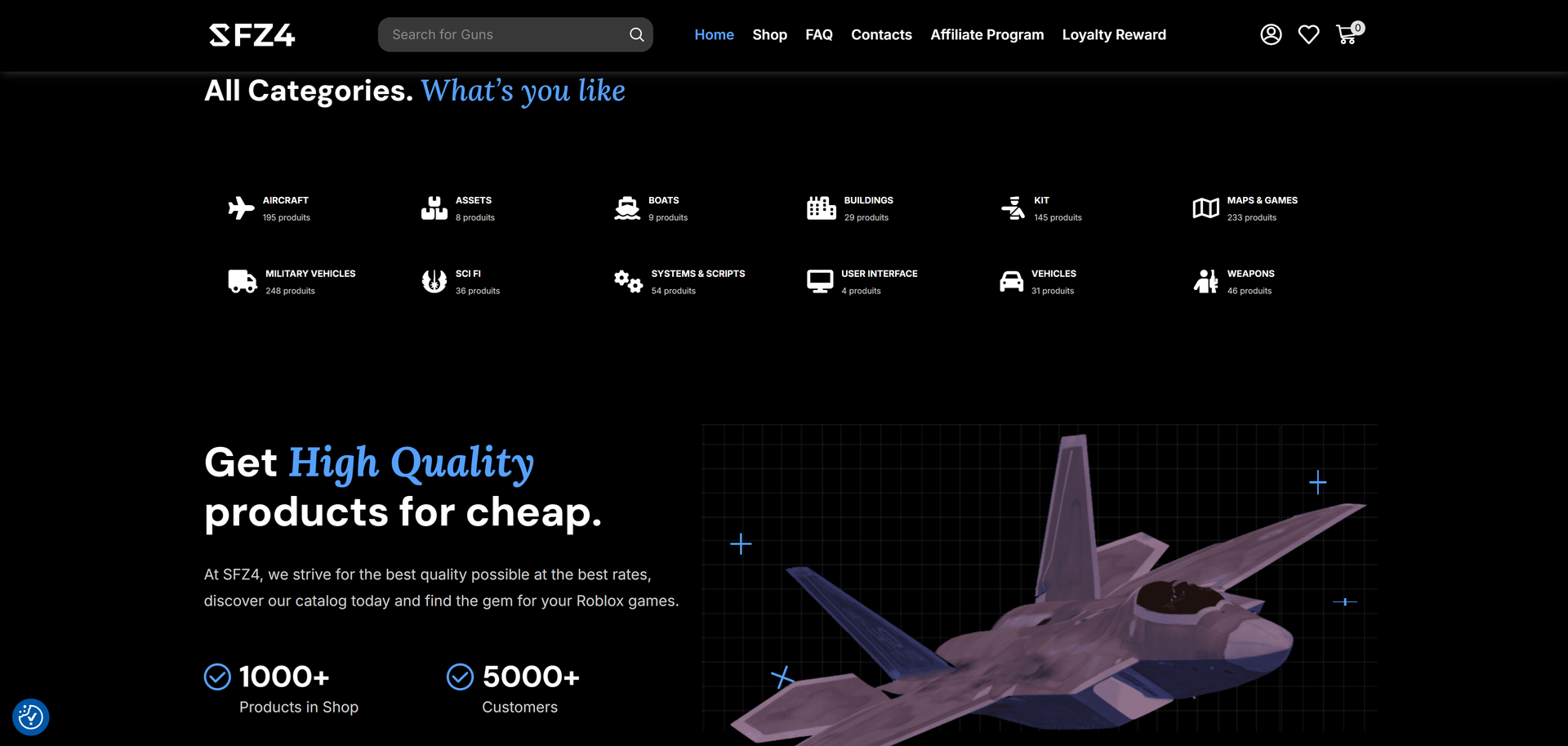 SFZ4 is a global provider of high-quality game development assets for Roblox creators. Selling exclusively online, they serve a worldwide community of developers looking for tools, models, and resources to level up their game-building projects.